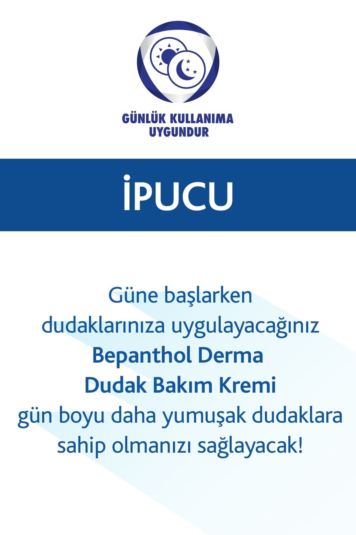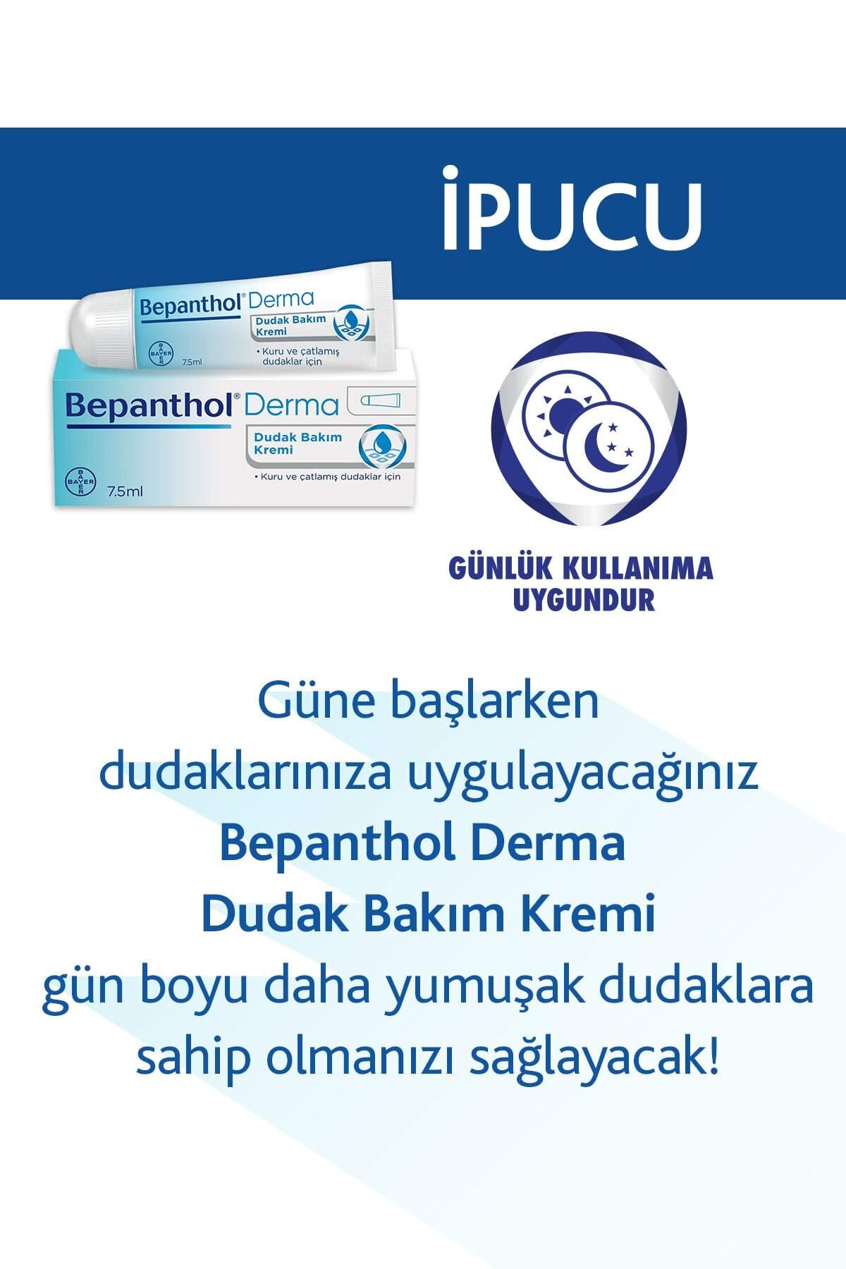 DUDAK KREMİ ; Dudaklar sadece yazın ve kışın kuruyup çatlamıyor. Onların her gün bakıma ihtiyacı var. Bepanthol® Dudak Bakım Kremi, içeriğindeki Provitamin B5 ve E vitaminiyle kuruyan ve çatlayan dudakları anında nemlendirir. Yumuşak ve pürüzsüz görünümlerini geri kazandırır. KullanımBepanthol® Dudak Bakım Kremi tüpünü sıkarak kremin dışarı çıkmasını sağlayın. Tüpün yuvarlak ucu yardımıyla dudaklarınıza sürün. Günlük kullanım için uygundur. Dudaklarınıza günde üç ya da dört kez uygulayabilirsiniz. İçeriğiBepanthol® Dudak Bakım Kremi, E vitamini ve Provitamin B5 olarak da bilinen, dekspantenol içerir. Dekspantenol, cildin ana yapıtaşını oluşturan vitaminlerdendir ve cilt için önemli bir vitamindir. Bepanthol® Dudak Bakım Kremi günlük dudak bakım rutininize uygun bir üründür. Çünkü ; Anında nemlendirme ve koruma özelliği ile dudakların yumuşak ve pürüzsüz görünümünü geri kazandırır. Bepanthol® Dudak Bakım Kremi parfüm ve paraben içermez ;