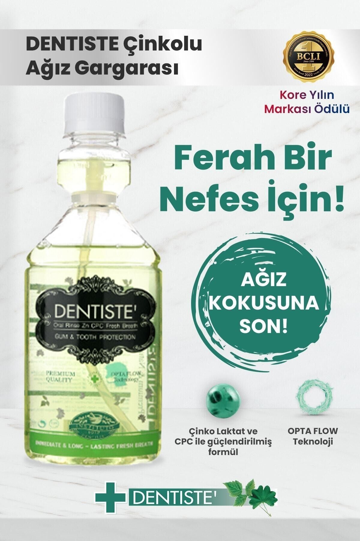 Ferah Bir Nefes İçin! Opta Flow Teknoloji İle Tükürük Salınımını Arttır! Dentiste’ Çinkolu ve CPC’li Ağız Gargarası ile ağız içindeki zararlı bakterilerin %99,9 unu 1 dakikadan kısa sürede öldürür. · ‘OPTA FLOW’ teknolojisi ile doğal temizleyici olan tükürük salınımını arttırır ve hijyen sağlar. İçeriğindeki Çinko Laktat ile ağız kokusunu 12 saate kadar ortadan kaldırırken ağız içinde oluşan tedavi sonrası tahrişlerin ve aftların iyileşmesine yardımcı olur. · CPC (Setilpiridinyum Klorür), plak ve tartarı azaltırken, ağız kokusunu dişleri sarartmadan engellemeye yardımcı olur. · Benzersiz Ürün kontrol haznesi ile ayrı bir kapta ölçmenize gerek kalmadan kullanın. Ambalajı elinize alıp gövdesine hafifçe bastırdığınızda kontrol haznesine isteğiniz miktarda ürünü dolacaktır. Kore’de 3 yıl üst üste “Yılın Markası” seçilen Dentiste Ferahlığını yaşayın!